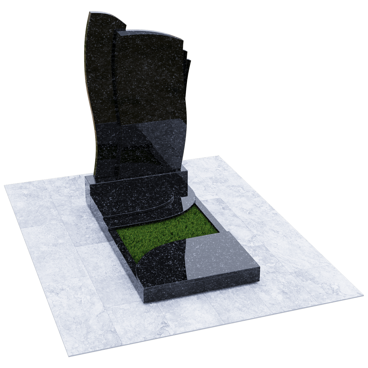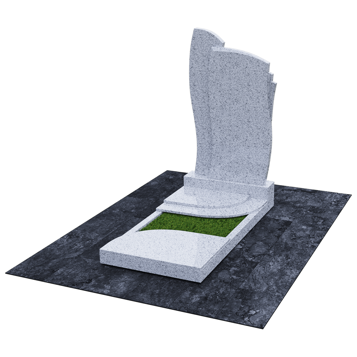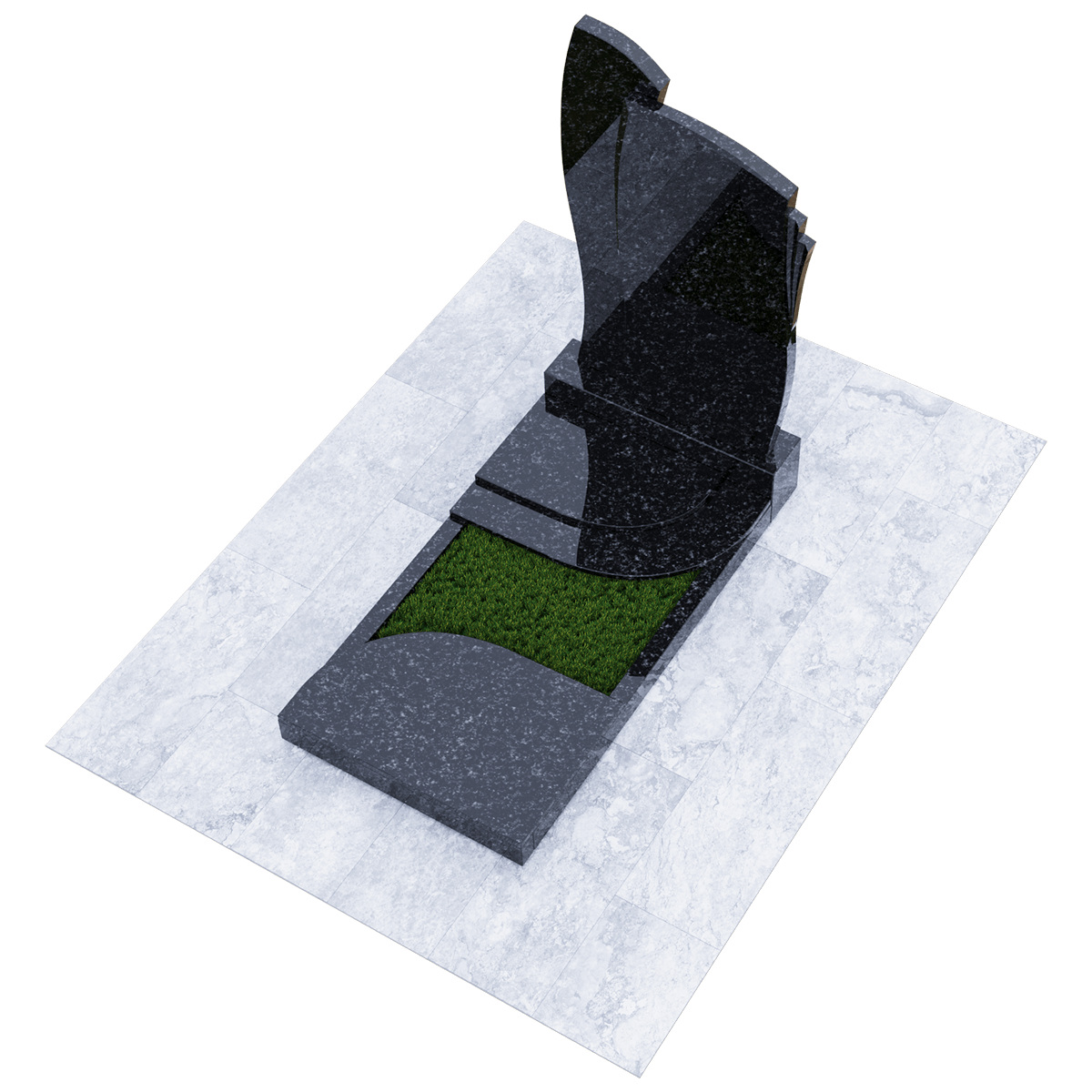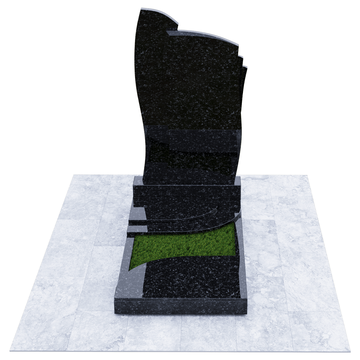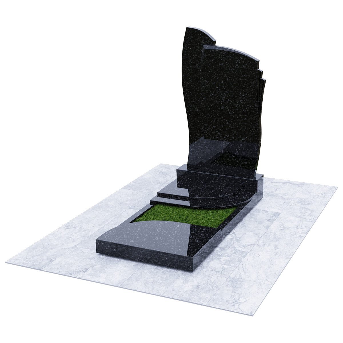 Мемориальное сооружение, изготовленное из натурального качественного гранита, предназначено для размещения на могиле при двойном семейном погребении. Сорт гранита черного цвета, который предоставляется для изготовления данного комплекса, обработан методом полировки. Зеркальная поверхность изделия в сочетании с природной прочностью горной породы гарантирует долгосрочное служение памятника в первозданном виде. Комплекс состоит из массивного постамента, на котором вертикально установлена стела, выполненная их двух частей, сливающихся в одно целое. Каждая часть имитирует развевающееся полотно, одно из которых с элементом многослойности. Надгробие, входящее в комплекс, состоит из прямоугольного каркаса, на котором расположены две округлые накладки, формирующие контур небольшого цветника. Одна из накладок имеет дополнительный слой из камня. Таким образом, надгробие и стела составляют гармоничное произведение, призванное увековечить память об ушедших в мир иной. Такой памятник является очень прочным изделием, не поддающимся разрушительному воздействию природы. Информационно-художественное оформление мемориального комплекса осуществляется передовыми технологиями гравировки, так же являющими гарантию прочности.