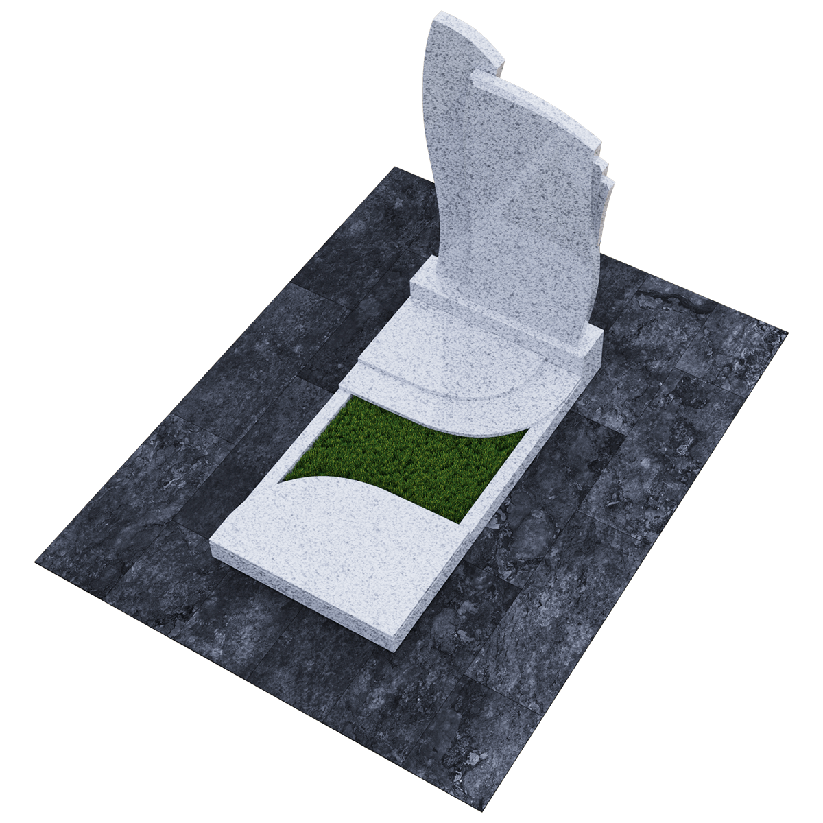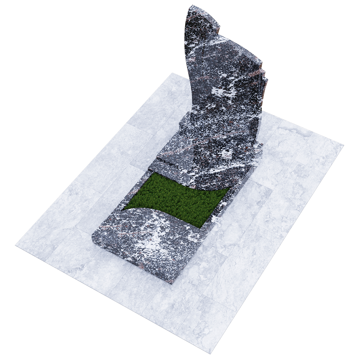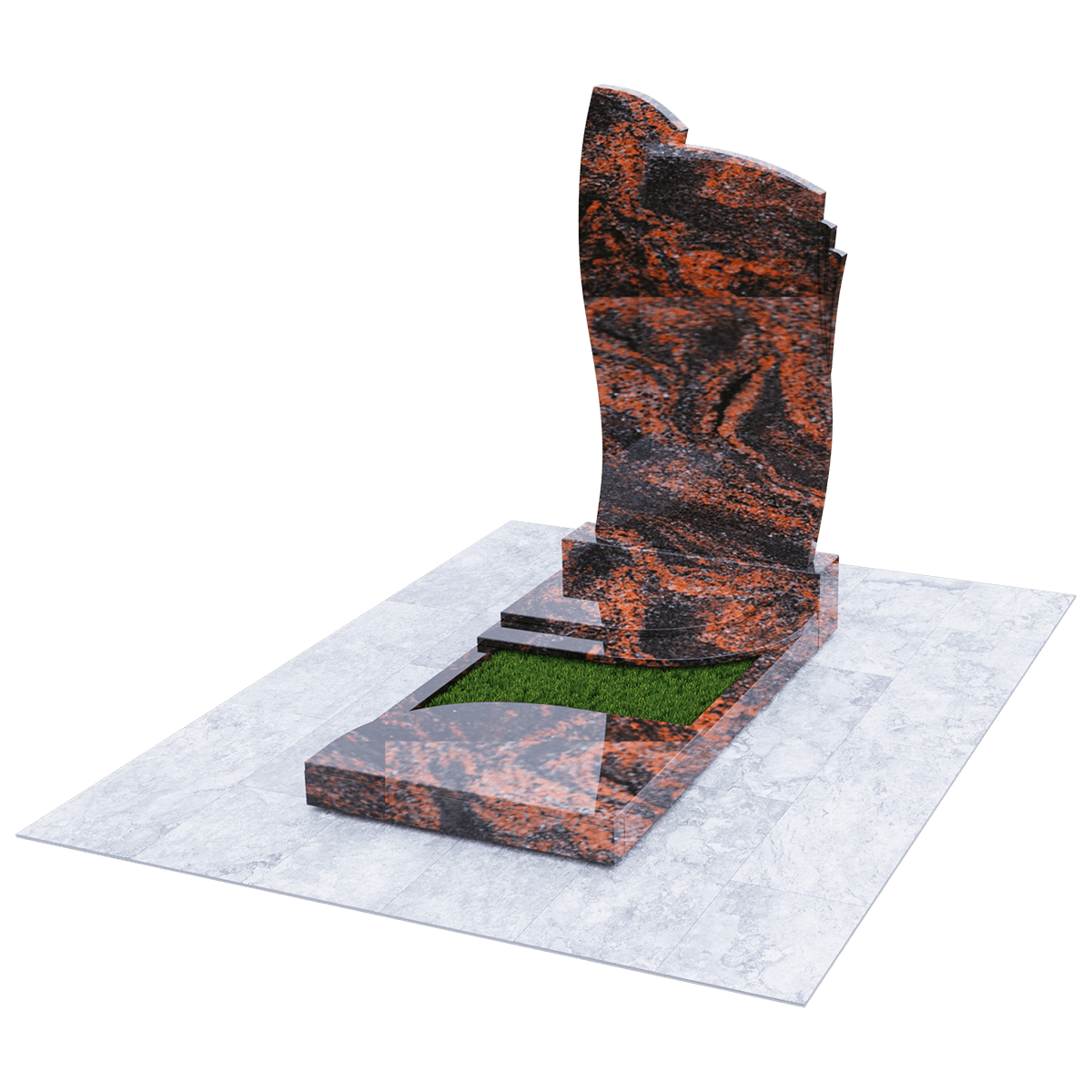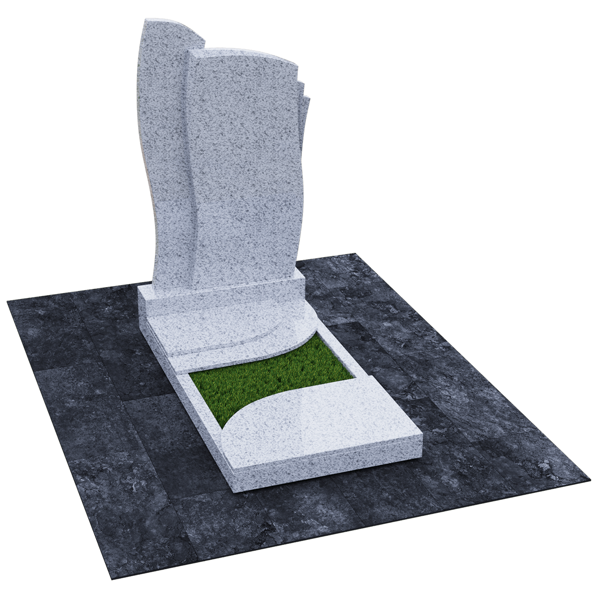Мемориальное сооружение, изготовленное из натурального качественного гранита, предназначено для размещения на могиле при двойном семейном погребении. Сорт гранита черного цвета, который предоставляется для изготовления данного комплекса, обработан методом полировки. Зеркальная поверхность изделия в сочетании с природной прочностью горной породы гарантирует долгосрочное служение памятника в первозданном виде. Комплекс состоит из массивного постамента, на котором вертикально установлена стела, выполненная их двух частей, сливающихся в одно целое. Каждая часть имитирует развевающееся полотно, одно из которых с элементом многослойности. Надгробие, входящее в комплекс, состоит из прямоугольного каркаса, на котором расположены две округлые накладки, формирующие контур небольшого цветника. Одна из накладок имеет дополнительный слой из камня. Таким образом, надгробие и стела составляют гармоничное произведение, призванное увековечить память об ушедших в мир иной. Такой памятник является очень прочным изделием, не поддающимся разрушительному воздействию природы. Информационно-художественное оформление мемориального комплекса осуществляется передовыми технологиями гравировки, так же являющими гарантию прочности.