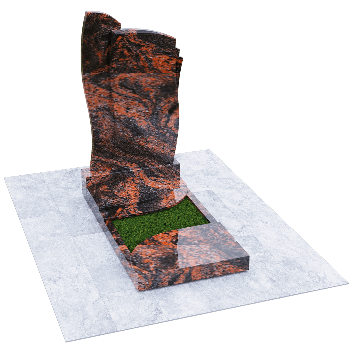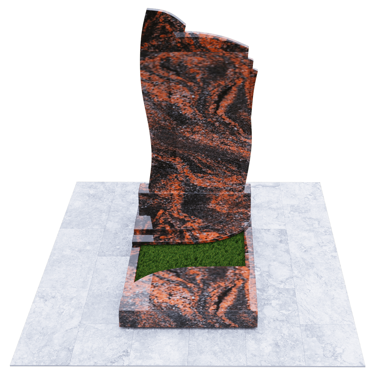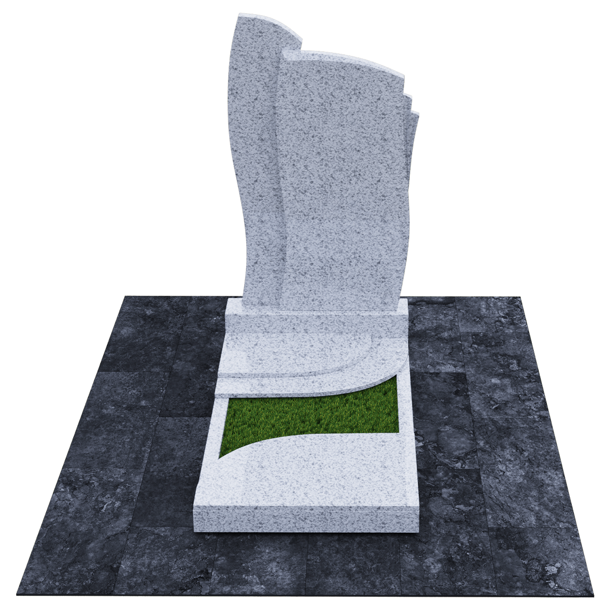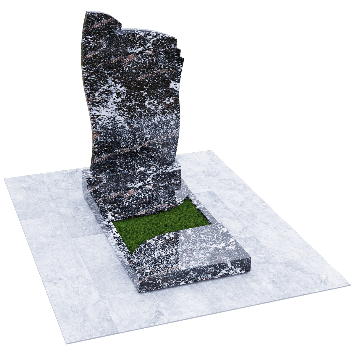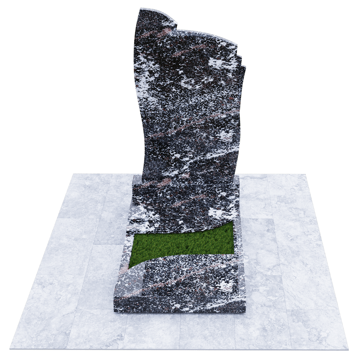 Мемориальное сооружение, изготовленное из натурального качественного гранита, предназначено для размещения на могиле при двойном семейном погребении. Сорт гранита черного цвета, который предоставляется для изготовления данного комплекса, обработан методом полировки. Зеркальная поверхность изделия в сочетании с природной прочностью горной породы гарантирует долгосрочное служение памятника в первозданном виде. Комплекс состоит из массивного постамента, на котором вертикально установлена стела, выполненная их двух частей, сливающихся в одно целое. Каждая часть имитирует развевающееся полотно, одно из которых с элементом многослойности. Надгробие, входящее в комплекс, состоит из прямоугольного каркаса, на котором расположены две округлые накладки, формирующие контур небольшого цветника. Одна из накладок имеет дополнительный слой из камня. Таким образом, надгробие и стела составляют гармоничное произведение, призванное увековечить память об ушедших в мир иной. Такой памятник является очень прочным изделием, не поддающимся разрушительному воздействию природы. Информационно-художественное оформление мемориального комплекса осуществляется передовыми технологиями гравировки, так же являющими гарантию прочности.