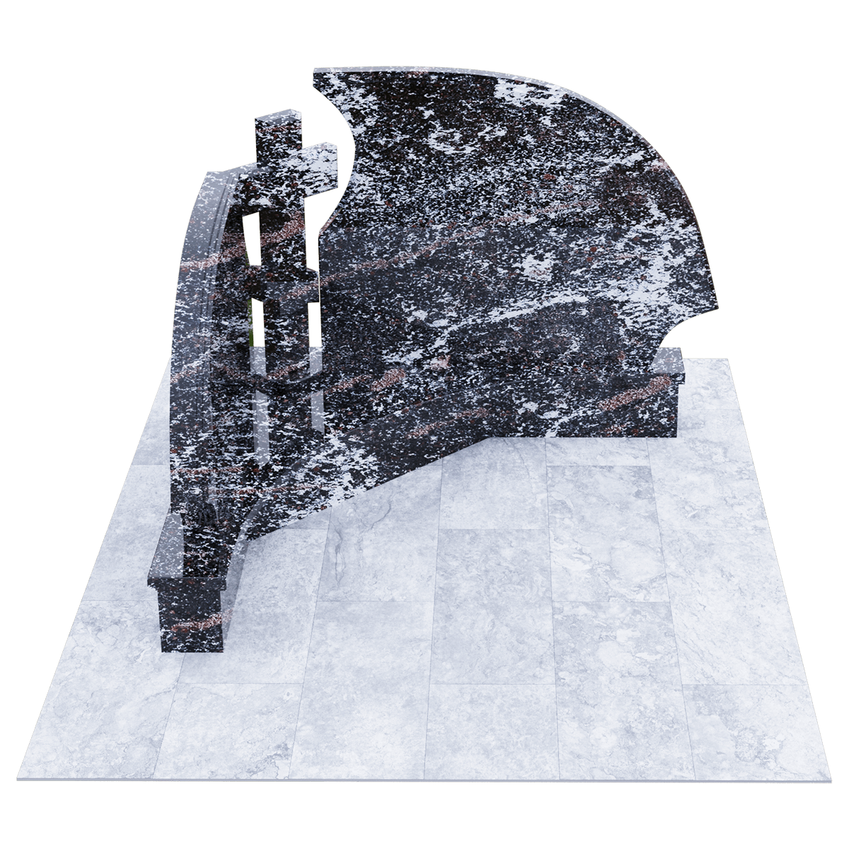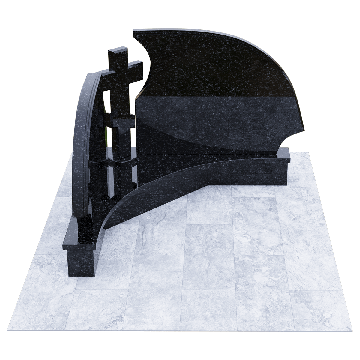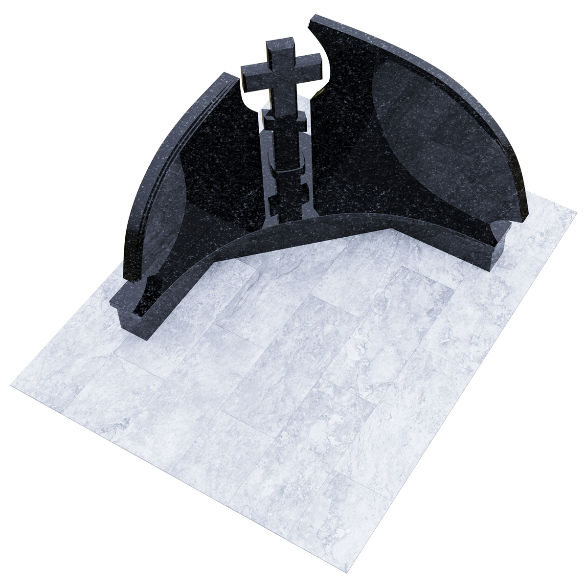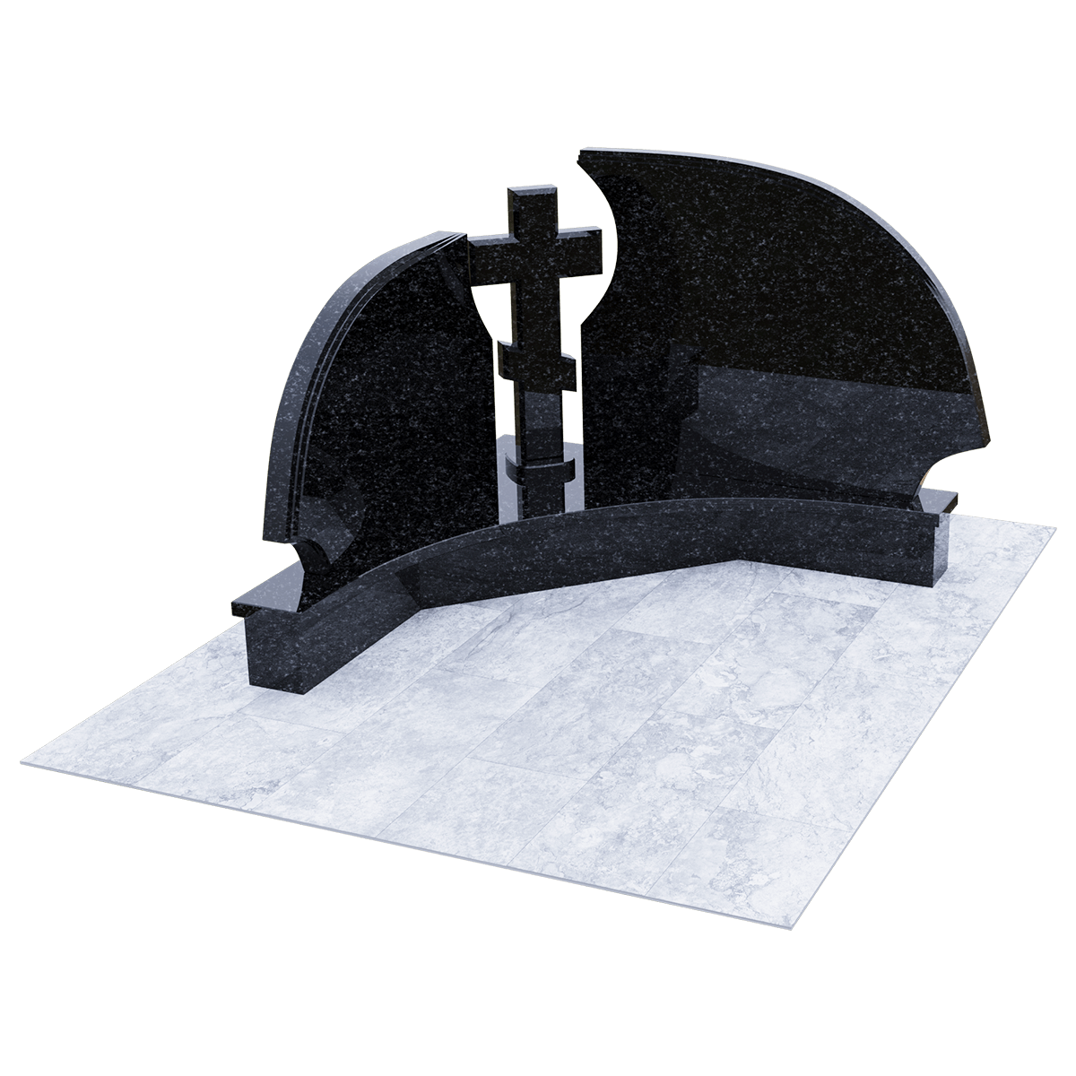 Ритуальный комплекс выполнен из натурального элитного черного гранита. Наиболее подходящий вариант памятника для размещения на родовом захоронении. Необычная прочность горной породы, образованной под воздействием максимальных температур и давления в недрах горных массивов, делает его избранным в изготовлении мемориалов. Перемены климатических условий имеют достаточно разрушительную силу, но гранит не реагирует на перепады температур, чем гарантирует долговечное служение изделия. Камень не впитывает влагу и загрязнения и неподвластен воздействию вредоносных микроорганизмов. Комплекс создан дизайнерами из гранита, обработанного методом полировки, что придает ему благородный вид. На изогнутом треугольном подиуме расположились две стелы, напоминающие произвольные каменные глыбы, разделенные между собой шестиконечным крестом. Слившиеся в единое целое детали мемориала необычного контура создают торжественно-траурный ансамбль. Площади поверхностей стел достаточны для размещения нескольких портретов, личных данных и эпитафий. Персональная информация и индивидуальный декор будут нанесены высокоточными методами гравировки.