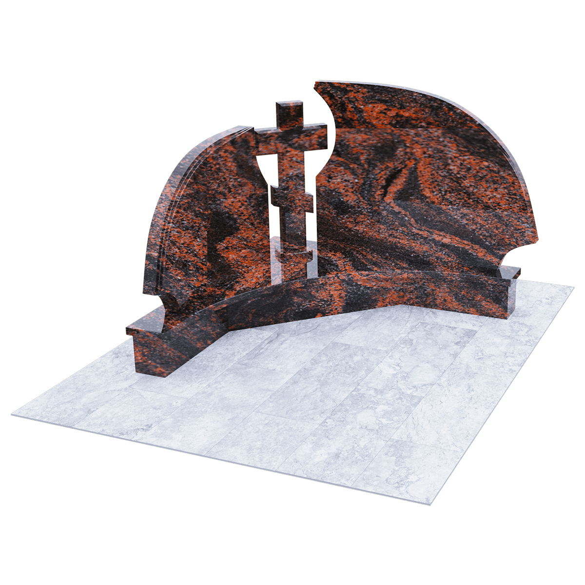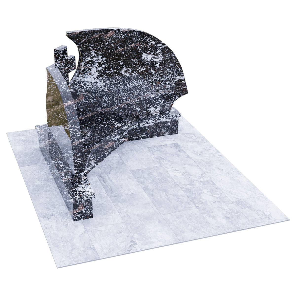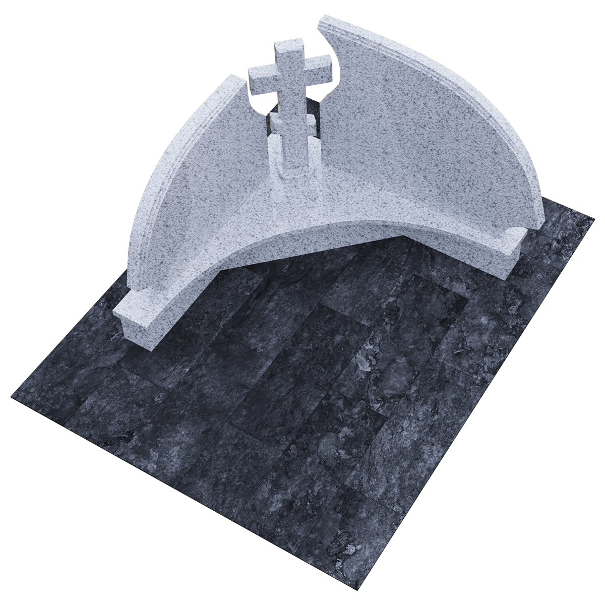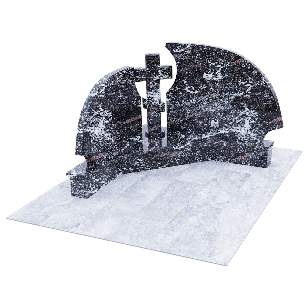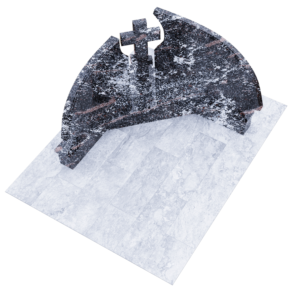 Ритуальный комплекс выполнен из натурального элитного черного гранита. Наиболее подходящий вариант памятника для размещения на родовом захоронении. Необычная прочность горной породы, образованной под воздействием максимальных температур и давления в недрах горных массивов, делает его избранным в изготовлении мемориалов. Перемены климатических условий имеют достаточно разрушительную силу, но гранит не реагирует на перепады температур, чем гарантирует долговечное служение изделия. Камень не впитывает влагу и загрязнения и неподвластен воздействию вредоносных микроорганизмов. Комплекс создан дизайнерами из гранита, обработанного методом полировки, что придает ему благородный вид. На изогнутом треугольном подиуме расположились две стелы, напоминающие произвольные каменные глыбы, разделенные между собой шестиконечным крестом. Слившиеся в единое целое детали мемориала необычного контура создают торжественно-траурный ансамбль. Площади поверхностей стел достаточны для размещения нескольких портретов, личных данных и эпитафий. Персональная информация и индивидуальный декор будут нанесены высокоточными методами гравировки.