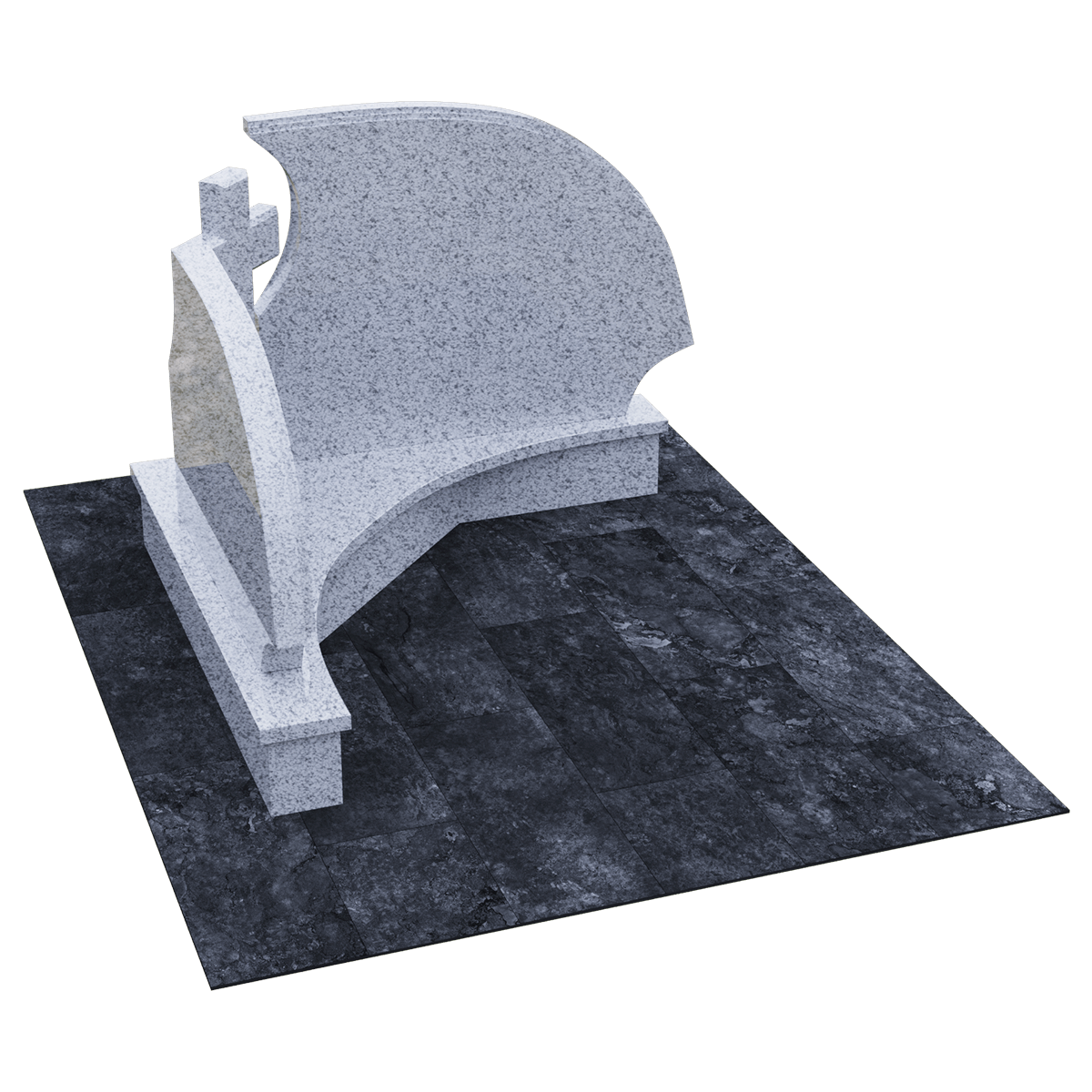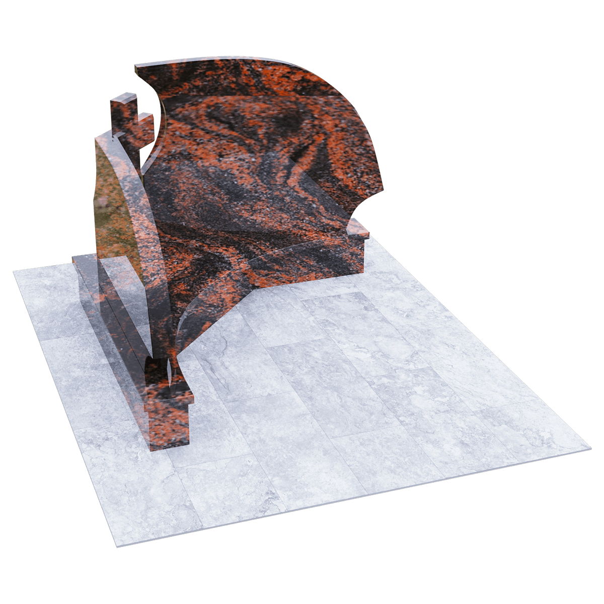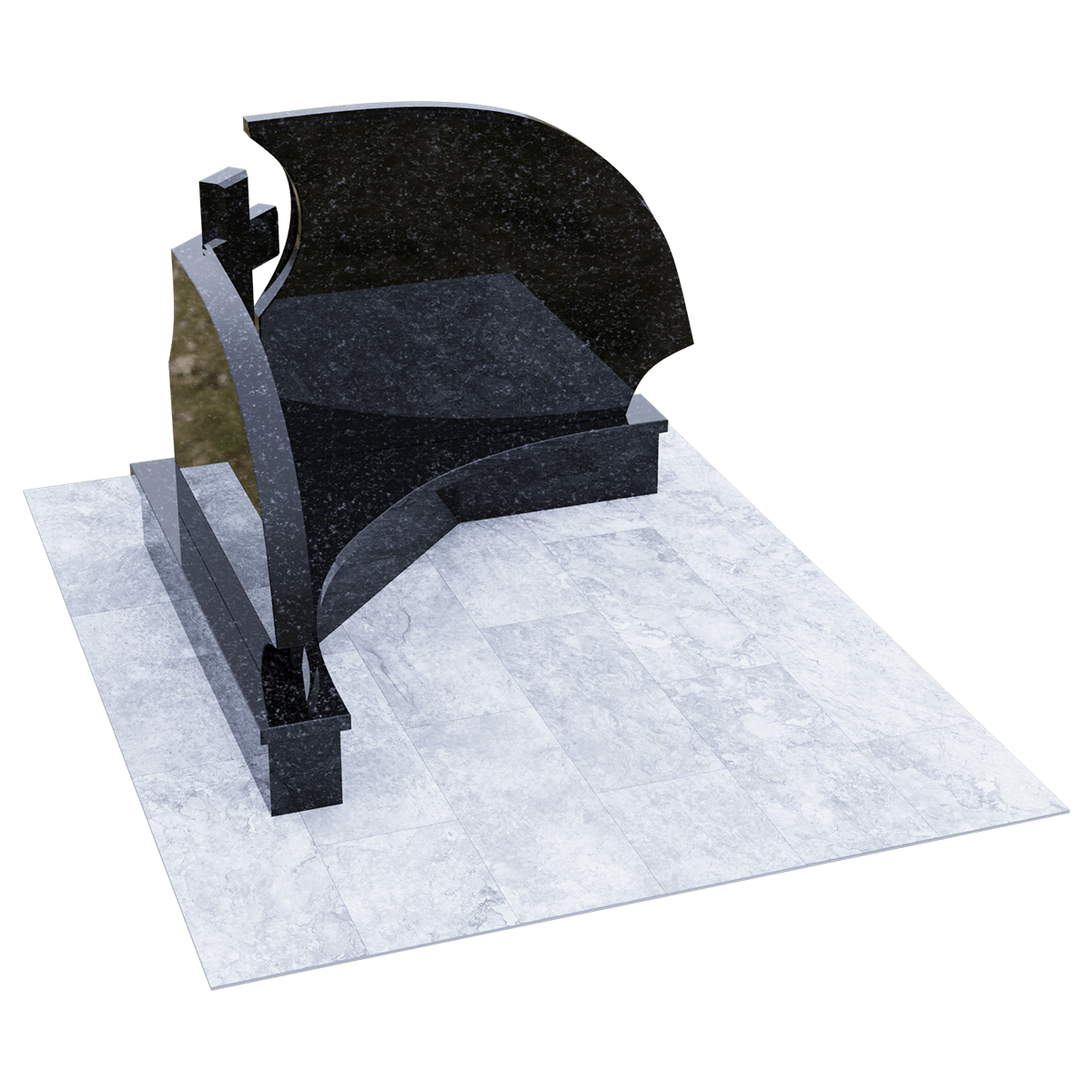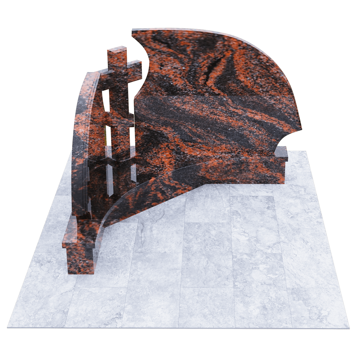 Ритуальный комплекс выполнен из натурального элитного черного гранита. Наиболее подходящий вариант памятника для размещения на родовом захоронении. Необычная прочность горной породы, образованной под воздействием максимальных температур и давления в недрах горных массивов, делает его избранным в изготовлении мемориалов. Перемены климатических условий имеют достаточно разрушительную силу, но гранит не реагирует на перепады температур, чем гарантирует долговечное служение изделия. Камень не впитывает влагу и загрязнения и неподвластен воздействию вредоносных микроорганизмов. Комплекс создан дизайнерами из гранита, обработанного методом полировки, что придает ему благородный вид. На изогнутом треугольном подиуме расположились две стелы, напоминающие произвольные каменные глыбы, разделенные между собой шестиконечным крестом. Слившиеся в единое целое детали мемориала необычного контура создают торжественно-траурный ансамбль. Площади поверхностей стел достаточны для размещения нескольких портретов, личных данных и эпитафий. Персональная информация и индивидуальный декор будут нанесены высокоточными методами гравировки.