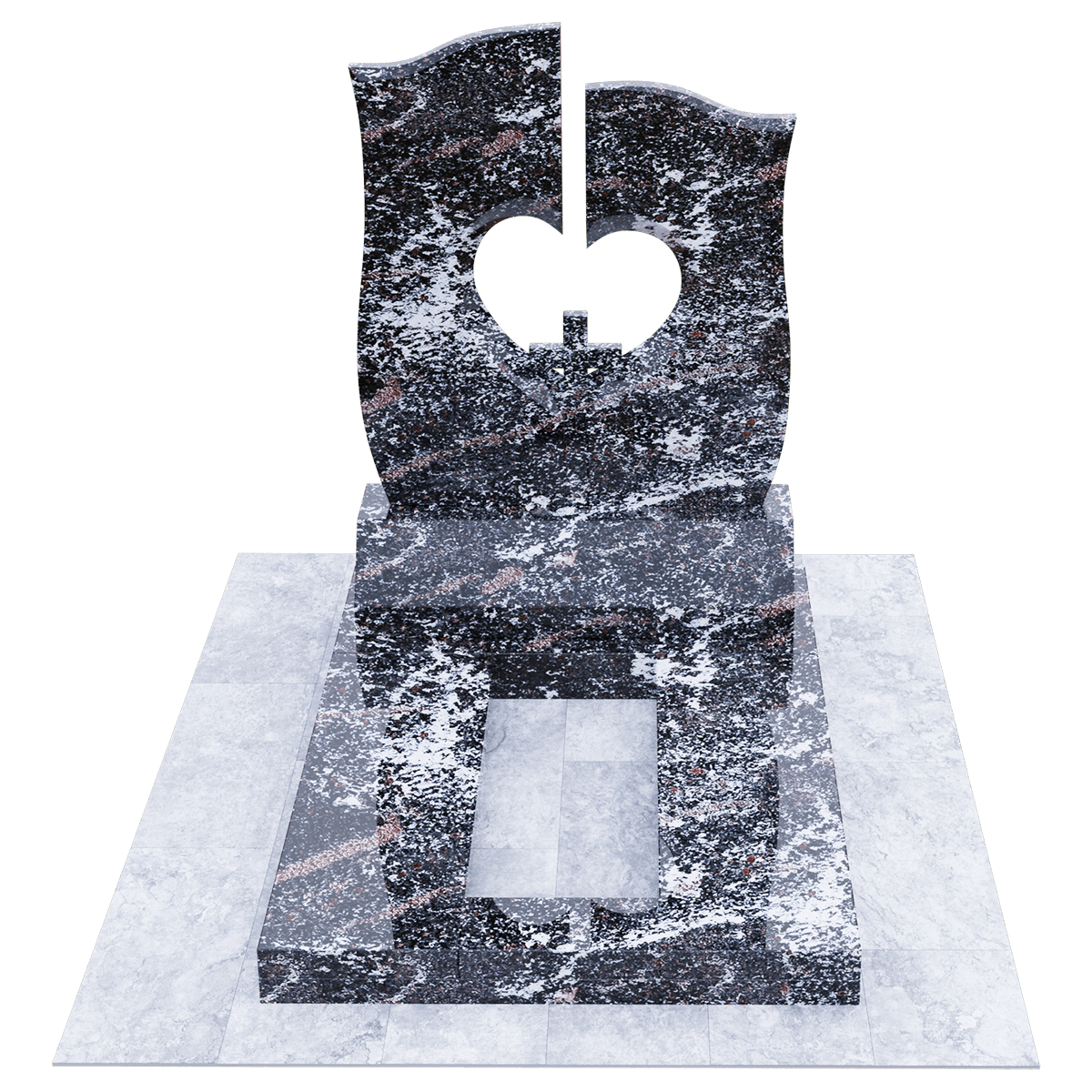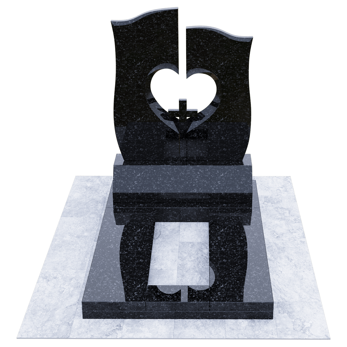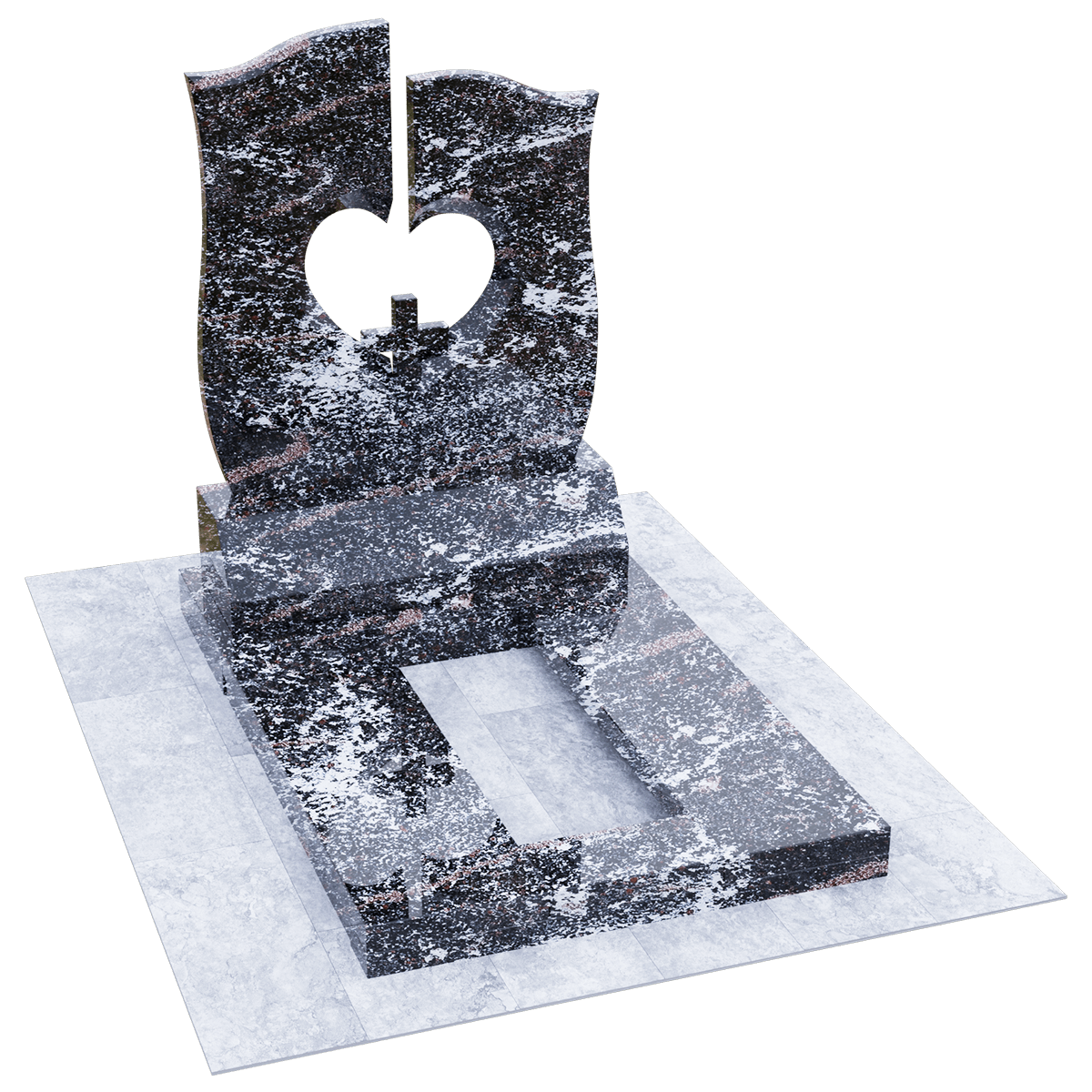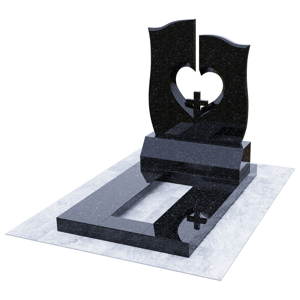 Комплекс ритуального назначения выполнен из натурального полированного гранита в моноцветном стиле. Широкое надгробие, рассчитанное на две могилы, предназначено для семейного захоронения. Две могильные плиты расположены на каркасе из черного камня с цветником посередине. Массивная трапециевидная плита служит основанием для стелы трогательного дизайна, где две вертикальные гранитные пластины замысловатых форм сливаются в одно целое, вырисовывая изображение сердца с миниатюрным крестом. Без слов понятно, что здесь нашли вечный покой те, кого в жизни объединила любовь, и смерть не смогла разлучить. Элитные сорта гранитного камня с природными вкраплениями и прожилками разноцветных минералов, под воздействием очень высоких температур и давления, образуют эксклюзивный материал, из которого создаются изысканные мемориалы, украшением которых является сам камень. Все сорта камня являются экологически безопасными для окружающей среды и обладают прочностью, гарантирующей надгробию неограниченный срок служения, без утраты своих первоначальных качеств. Уход за таким изделием минимальный – удаление легких загрязнений, пыльного налета. Поверхность гранита легко поддается любой обработке, в том числе гравировке, с помощью которой будет осуществлено информационно-художественное оформление комплекса.