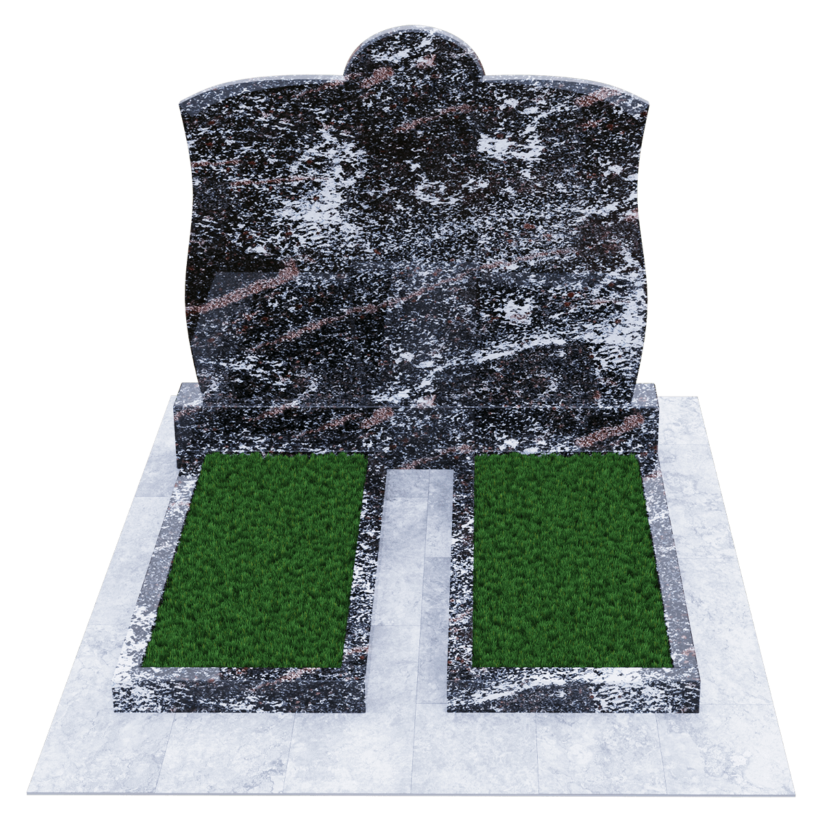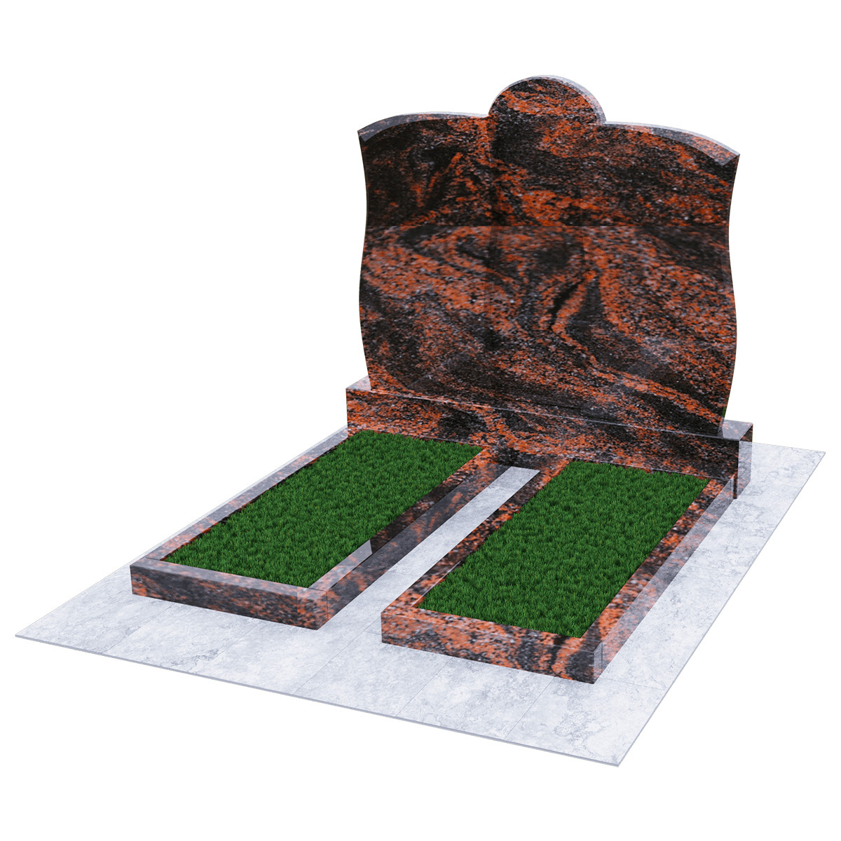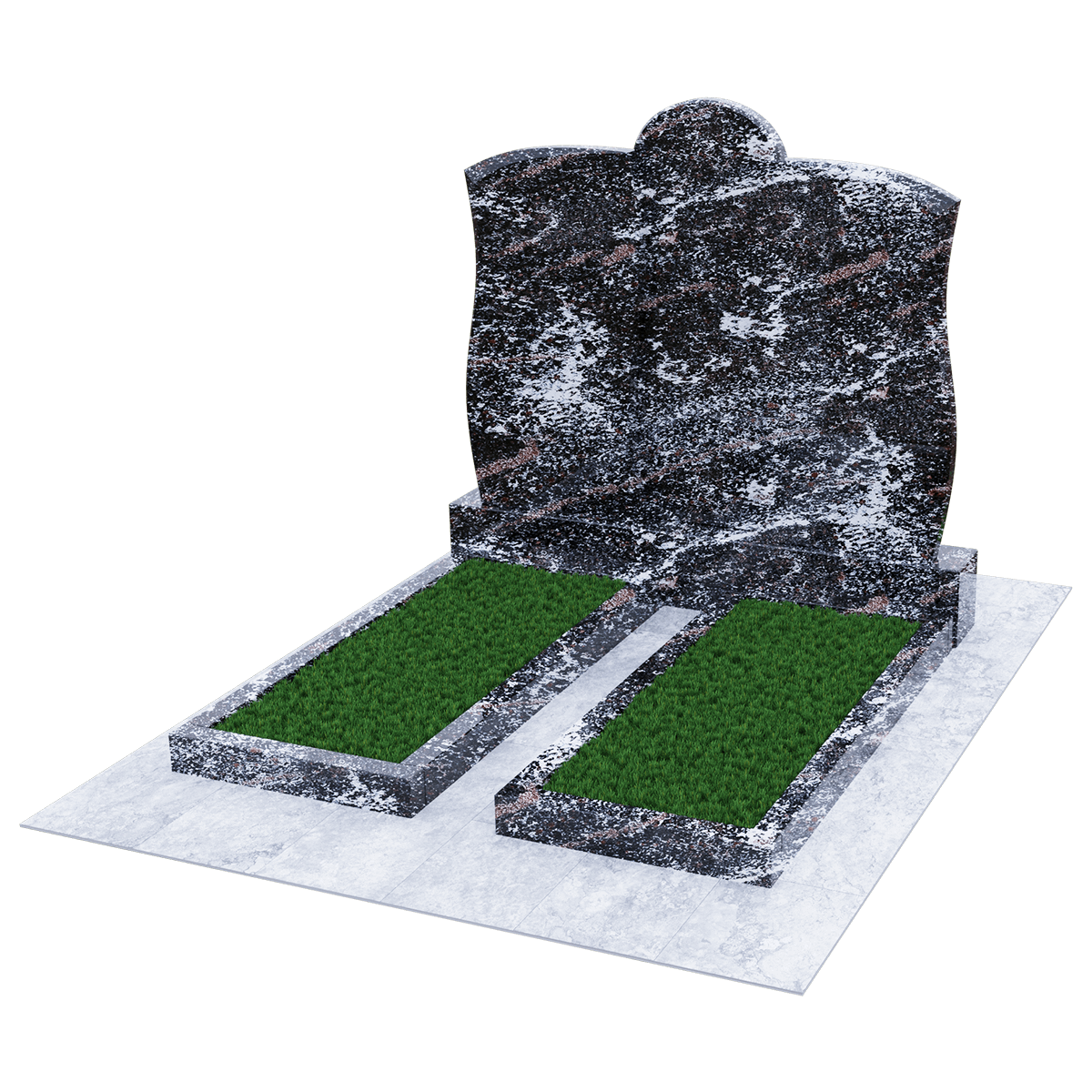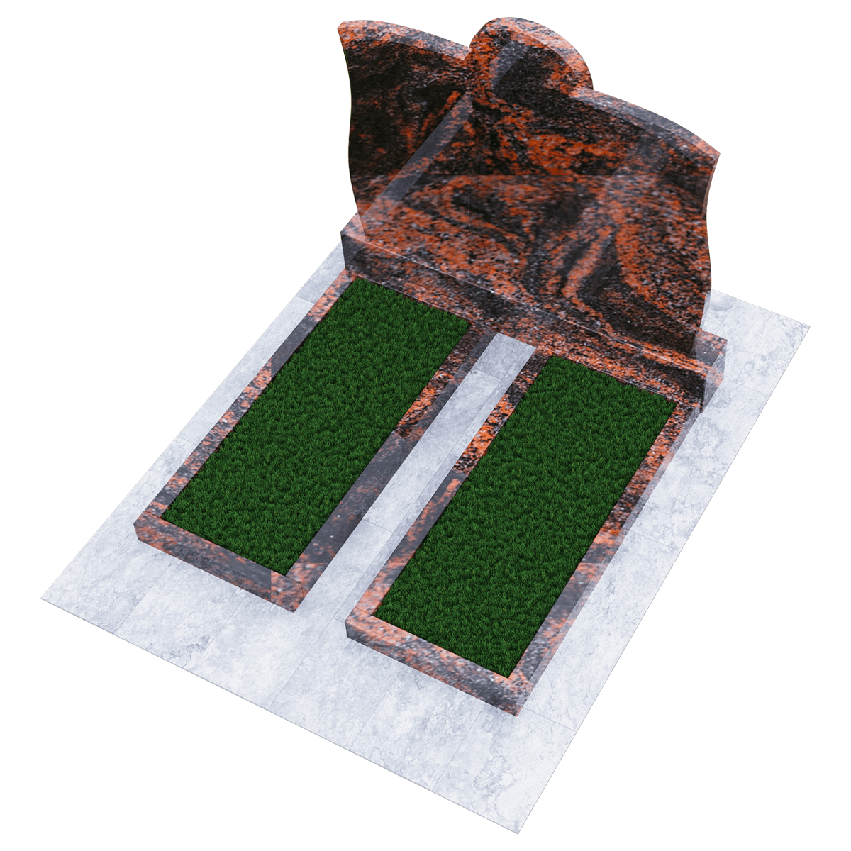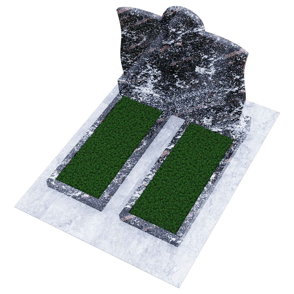 Мемориальный монументальный комплекс, предназначенный для расположения на семейном захоронении на кладбище, выполнен из натурального гранита, обработанного методом полировки. Предложенный сорт, в уникальном сочетании различных минералов, выраженных разноцветными вкраплениями и прожилками, создает изысканные ансамбли торжественно-сдержанных надгробий. Изготовление мемориалов именно из натурального гранита неслучайны, так как эта порода, в силу своего происхождения является наиболее прочной и твердой, но при этом легкой в обработке. Мемориал составляет комплекс, включающий два надгробия, массивное основание и стелу. Надгробия выполнены в форме прямоугольных открытых цветников, с косынками-накладками на торцевых сторонах, на которых можно расположить ритуальные аксессуары. Цветники крепятся к широкой балке-основанию, на которой установлена объемная стела. Два фрагмента стелы, имитируют траурные полотна, расположенные симметрично, относительно вертикальной стойки с куполообразной верхушкой. Каждое из полотен будет содержать информационную персональную информацию соответственно надгробию. Информация и элементы декора, по выбору, выполняются методом гравировки.