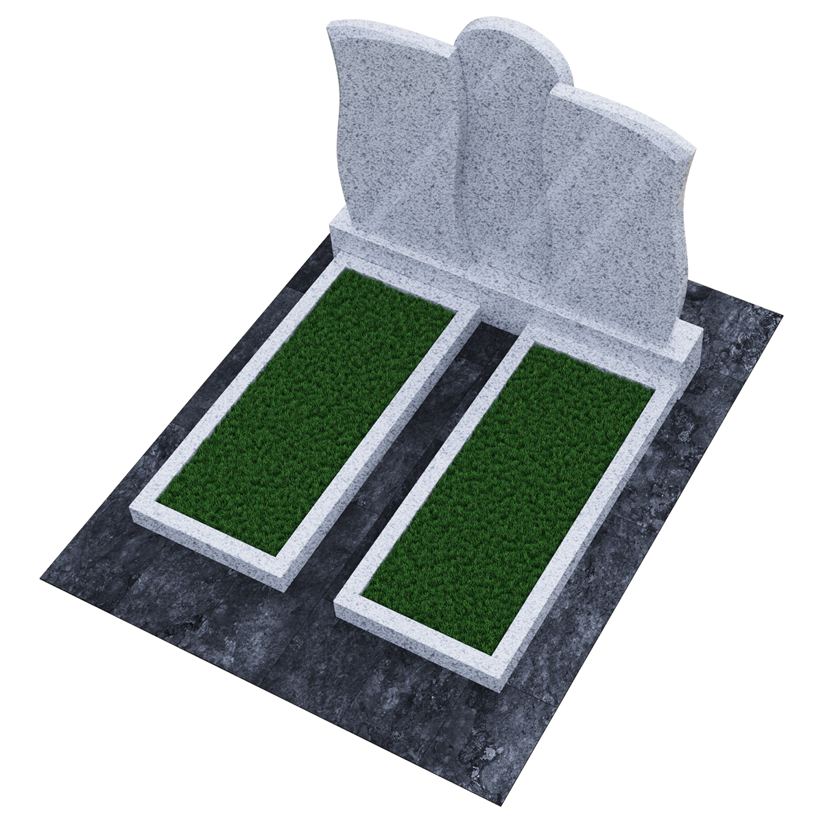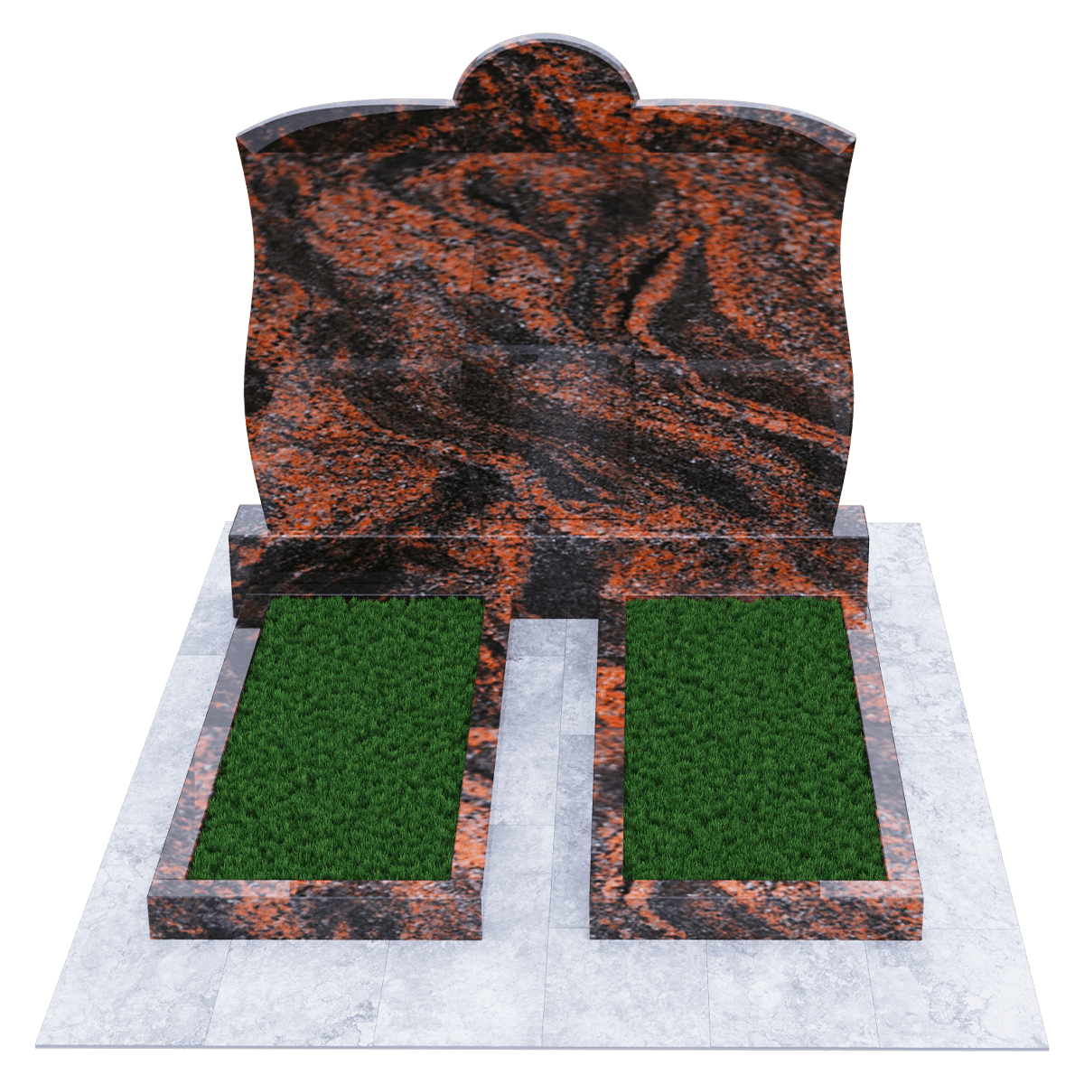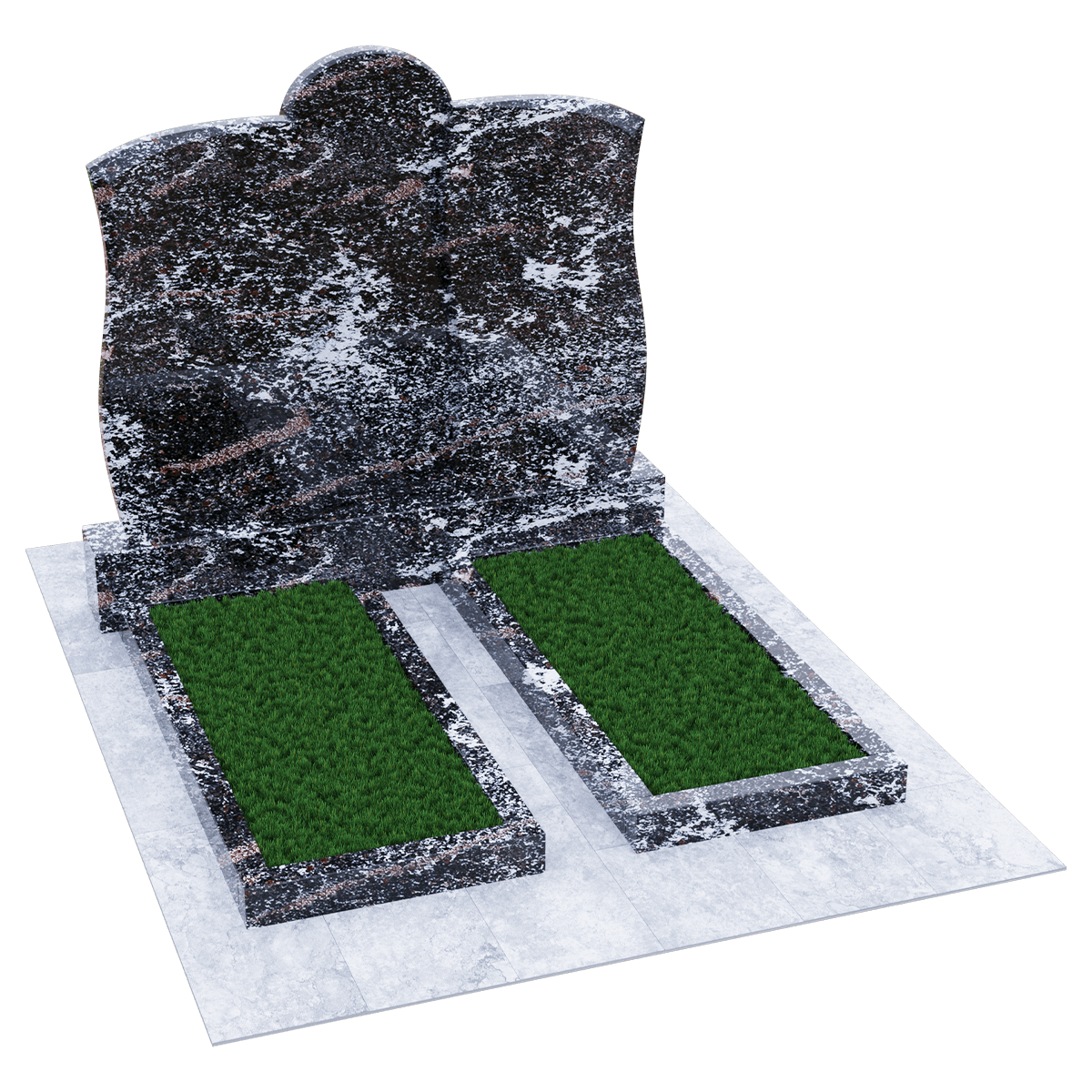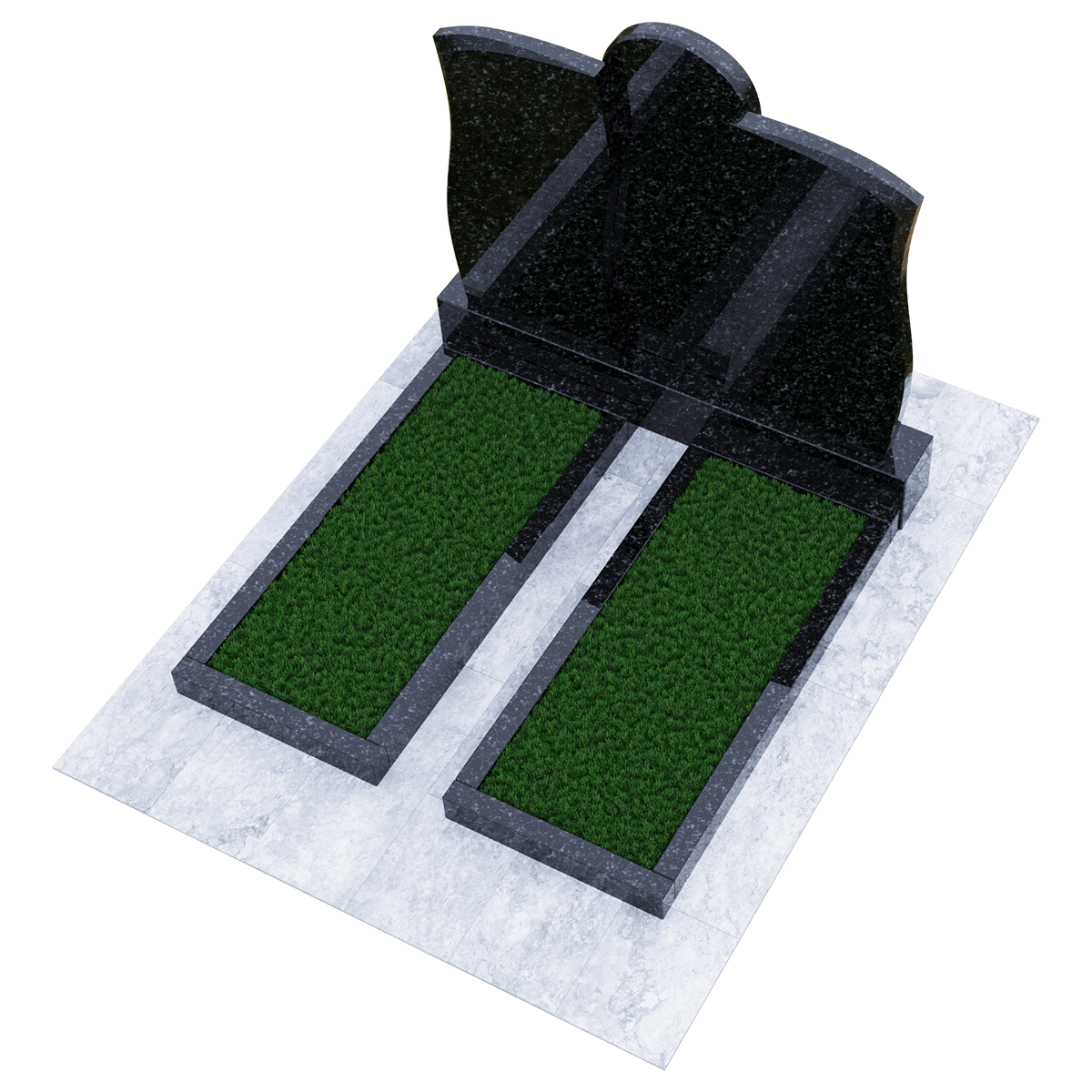 Мемориальный монументальный комплекс, предназначенный для расположения на семейном захоронении на кладбище, выполнен из натурального гранита, обработанного методом полировки. Предложенный сорт, в уникальном сочетании различных минералов, выраженных разноцветными вкраплениями и прожилками, создает изысканные ансамбли торжественно-сдержанных надгробий. Изготовление мемориалов именно из натурального гранита неслучайны, так как эта порода, в силу своего происхождения является наиболее прочной и твердой, но при этом легкой в обработке. Мемориал составляет комплекс, включающий два надгробия, массивное основание и стелу. Надгробия выполнены в форме прямоугольных открытых цветников, с косынками-накладками на торцевых сторонах, на которых можно расположить ритуальные аксессуары. Цветники крепятся к широкой балке-основанию, на которой установлена объемная стела. Два фрагмента стелы, имитируют траурные полотна, расположенные симметрично, относительно вертикальной стойки с куполообразной верхушкой. Каждое из полотен будет содержать информационную персональную информацию соответственно надгробию. Информация и элементы декора, по выбору, выполняются методом гравировки.