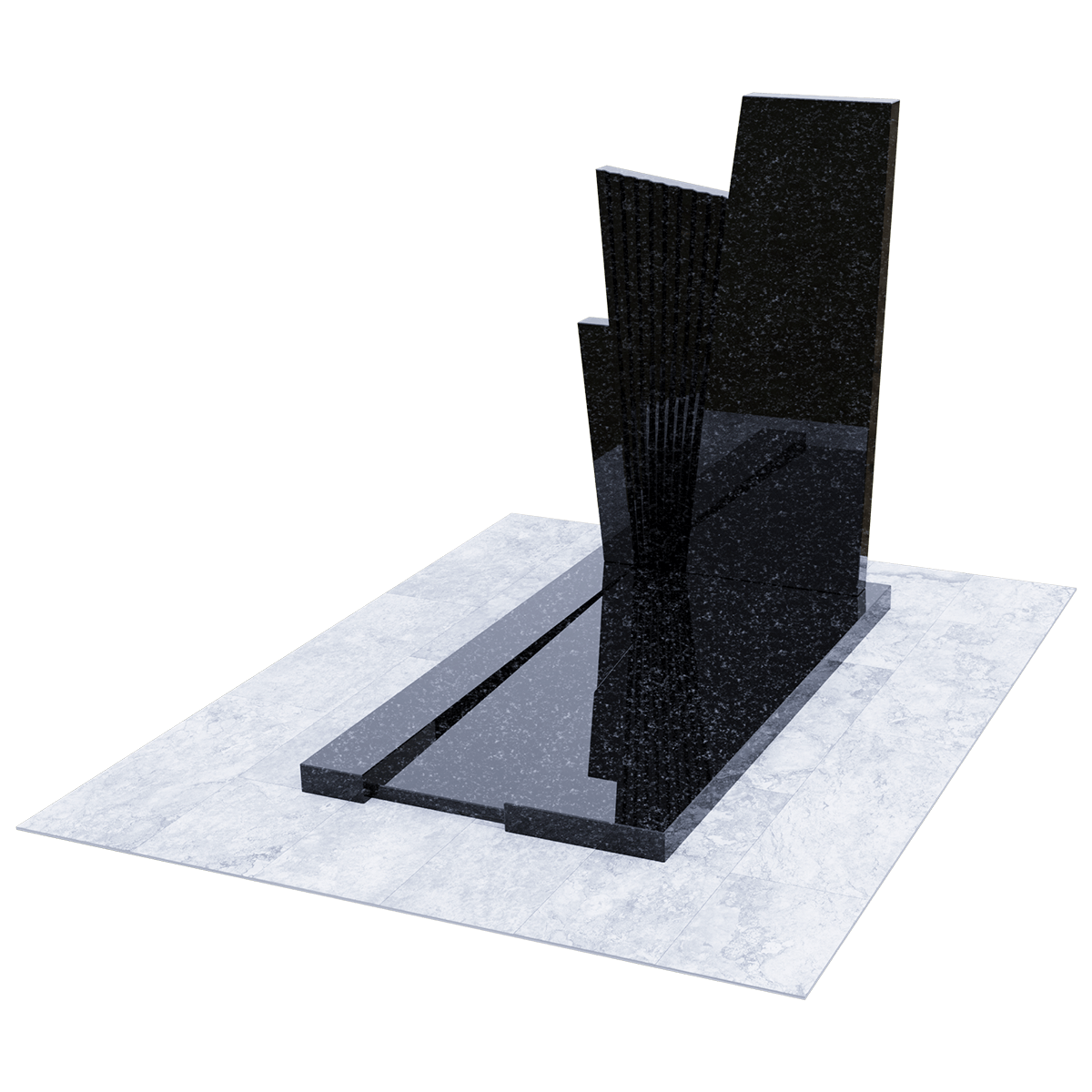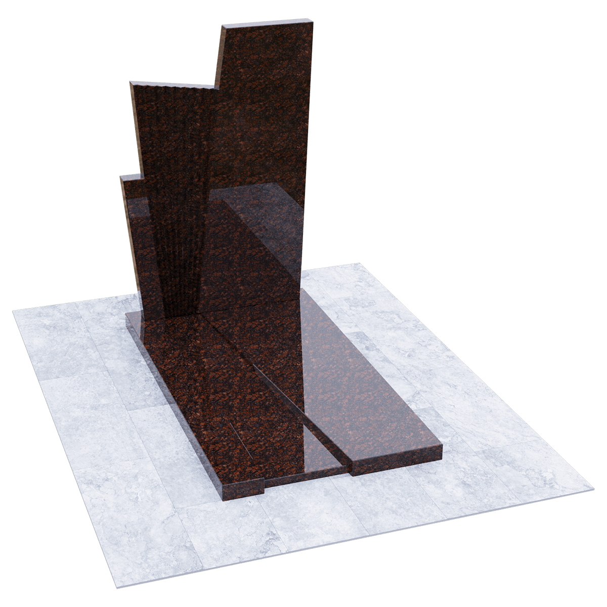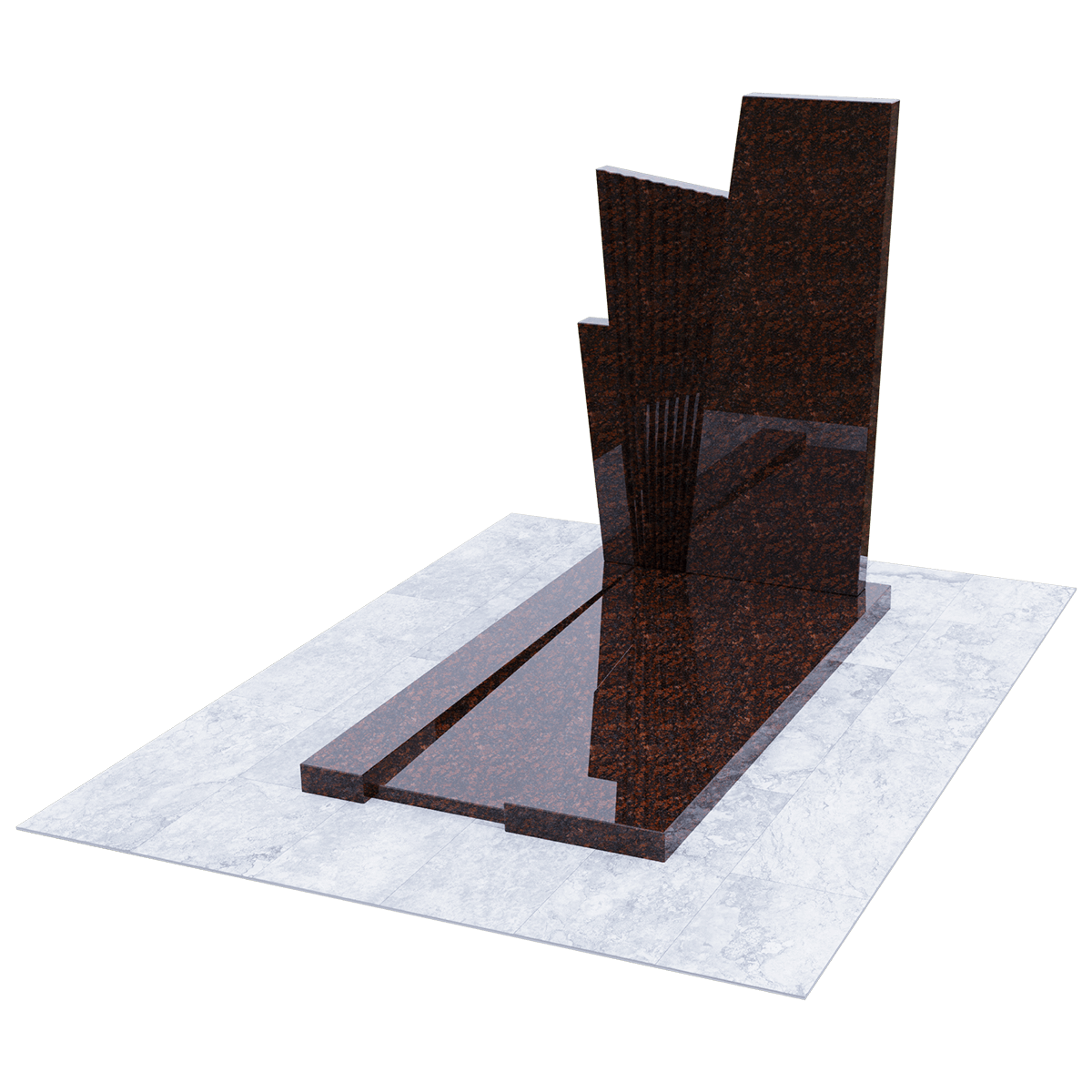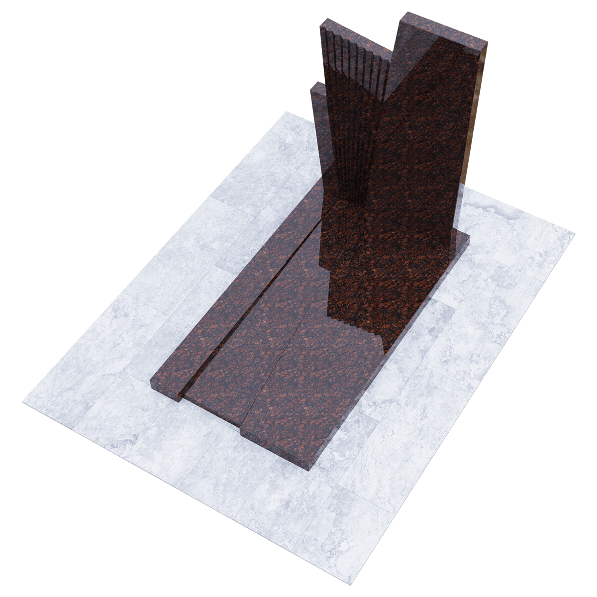 Ритуальное сооружение, предназначенное для расположения на двойном родственном могильном захоронении на кладбище, выполнено с использованием нескольких сортов натурального гранита. Обработанный методом полировки камень, с природными разводами и вкраплениями разноцветных минералов, определяющих его цвет, помимо внешнего торжественного изящества, является и одним из самых прочных и надежных мемориальных сооружений. Не нуждаясь в применении различных защитных средств, памятник будет служить долгие годы, не подвергаясь разрушению от воздействия агрессивной внешней среды, так как его происхождение сопряжено с высоким атмосферным давлением и запредельно высокой температурой. Гранит не выделяет вредных испарений и является абсолютно экологически безопасным материалом. Данный ритуальный комплекс состоит из надгробной плиты и вертикальной стелы. Стела включает в себя три фрагмента разной высоты, расположенных веерообразно. Центральная часть декорирована продольными линиями, имитирующими гофрировку. Форма надгробия зеркально отражает расположение стелы и так же состоит из трех фрагментов разной формы и объема. На полированную поверхность стелы и надгробия методом гравировки наносятся хронологические данные и, по желанию, художественный декор.