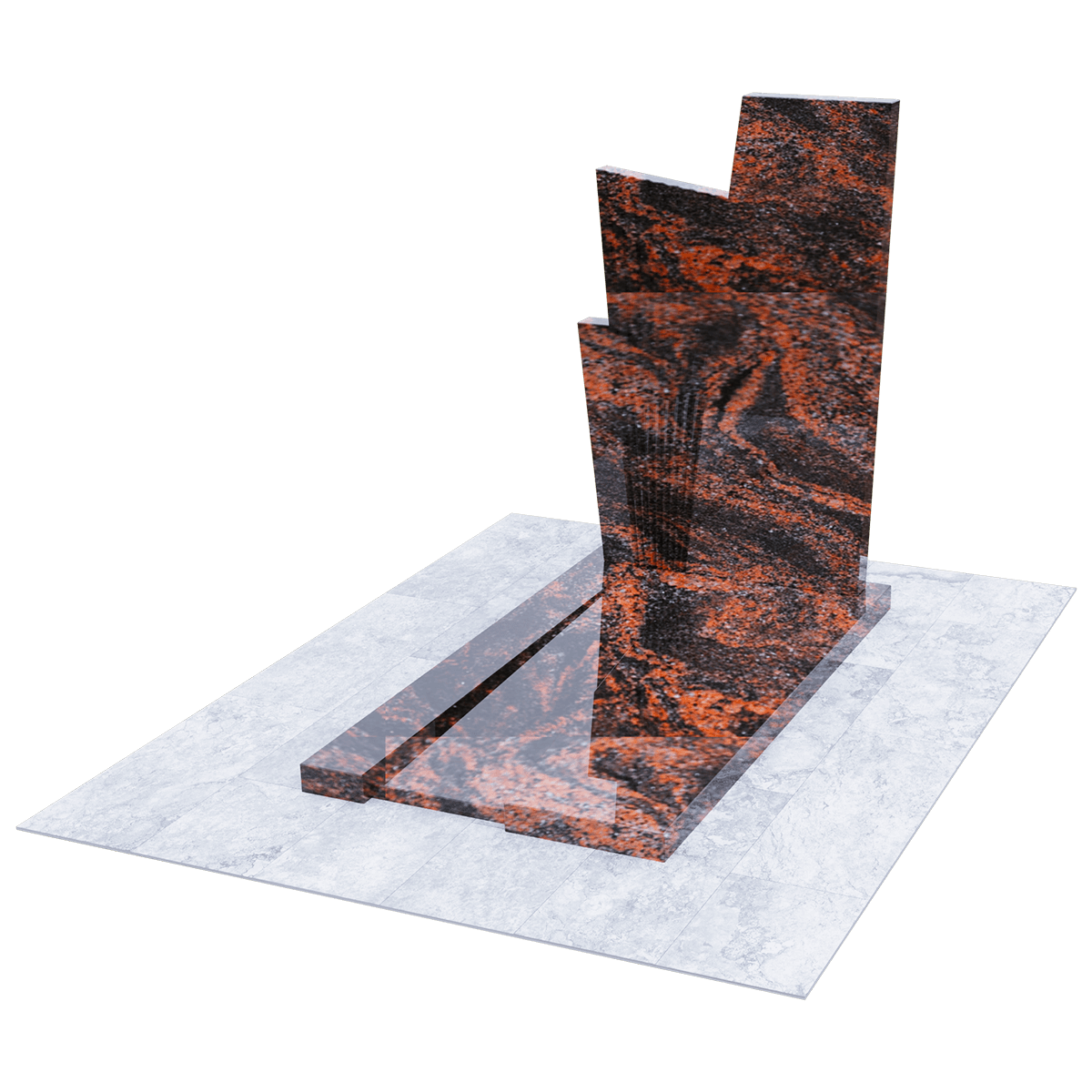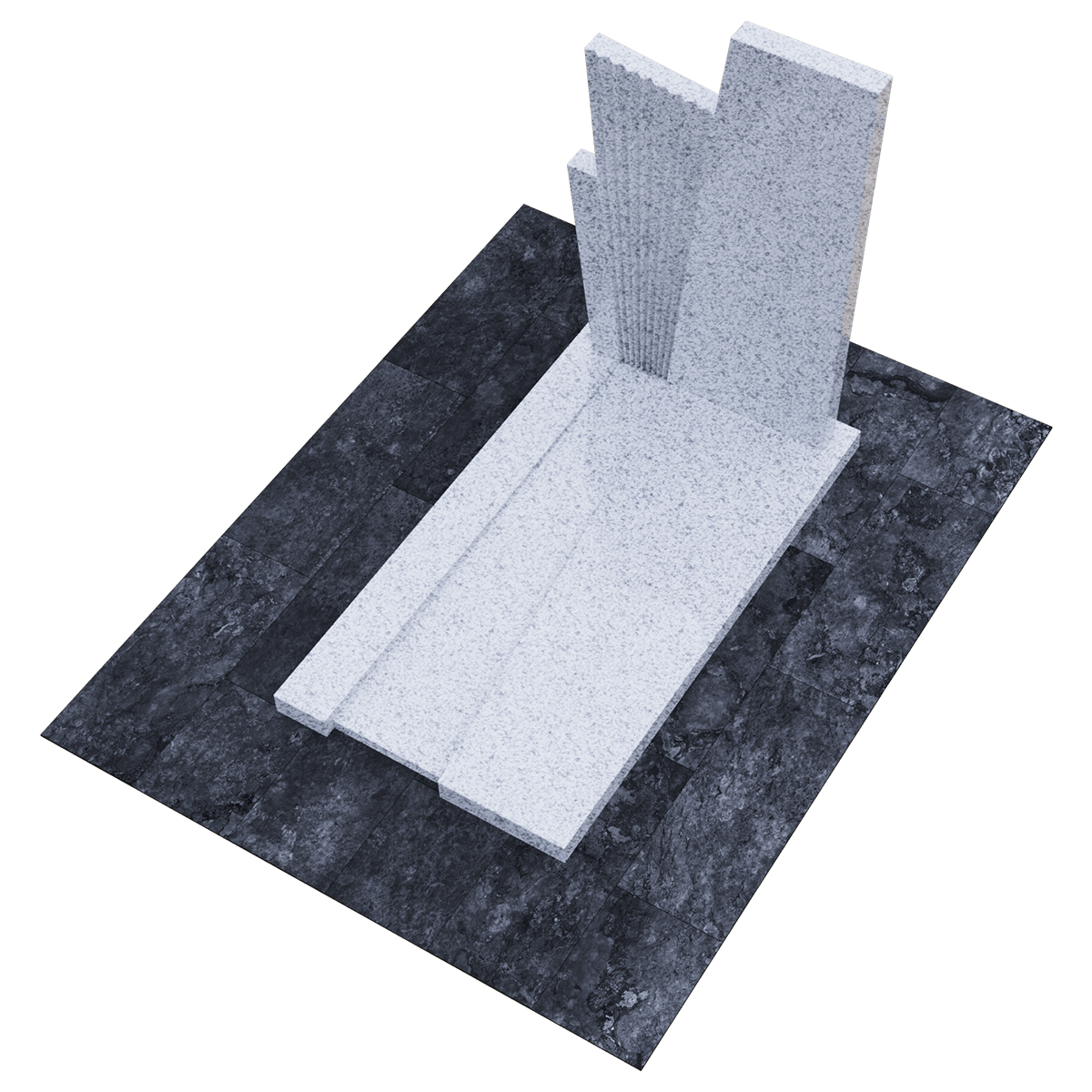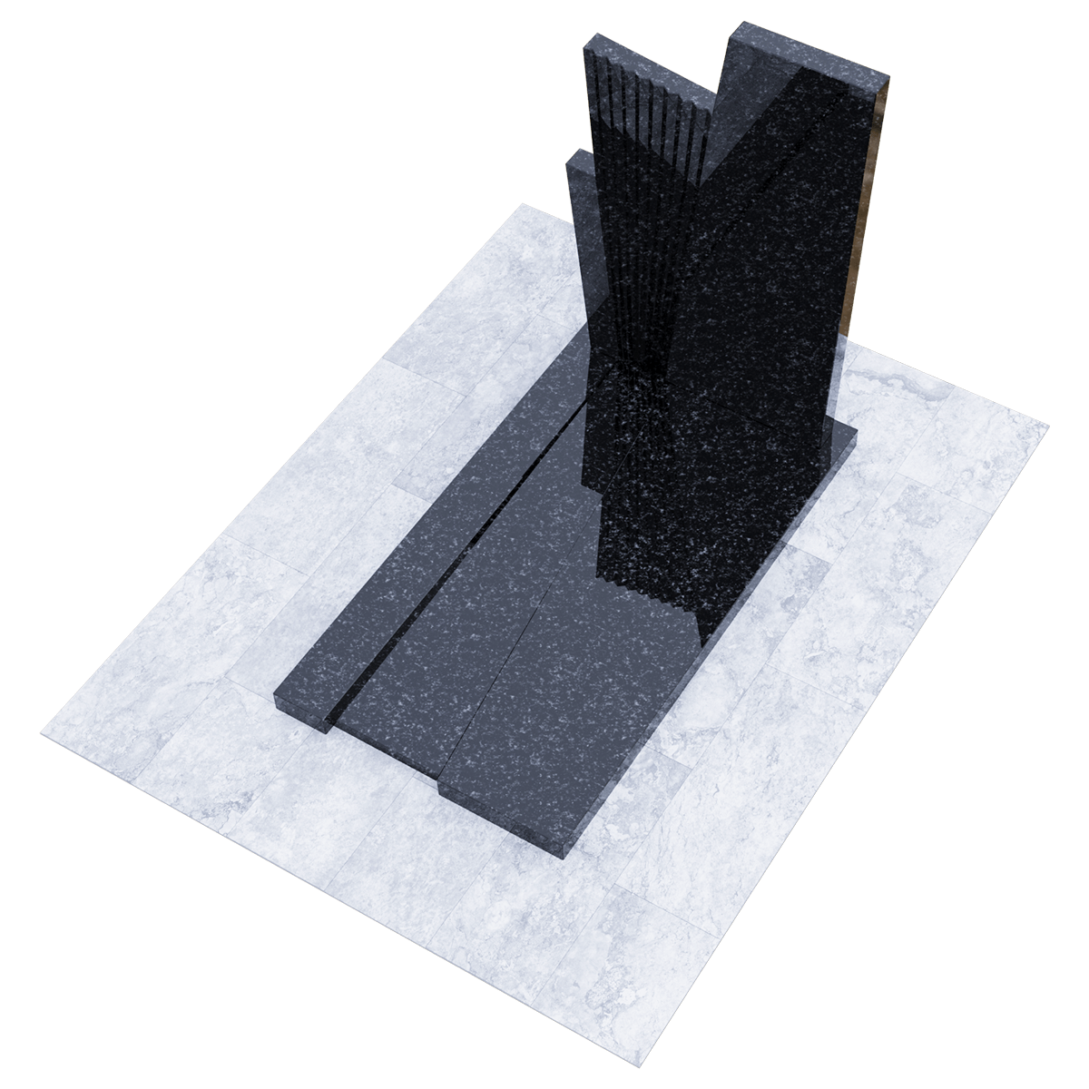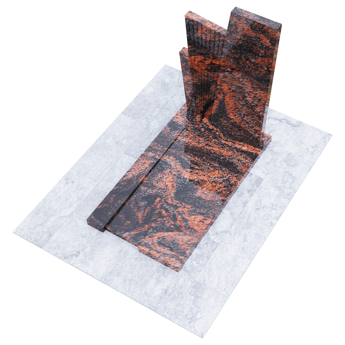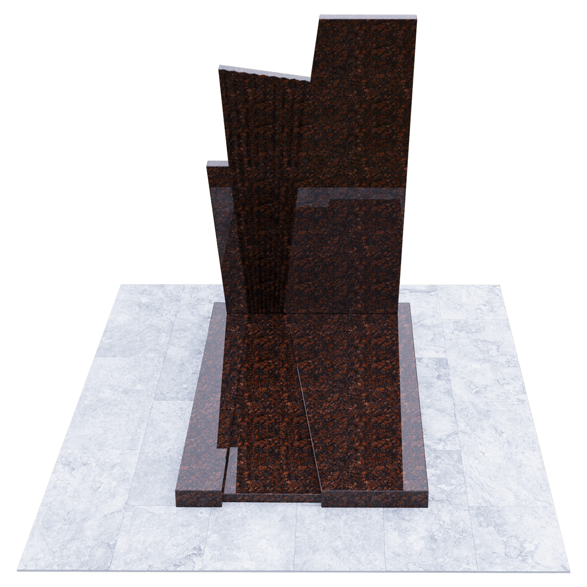 Ритуальное сооружение, предназначенное для расположения на двойном родственном могильном захоронении на кладбище, выполнено с использованием нескольких сортов натурального гранита. Обработанный методом полировки камень, с природными разводами и вкраплениями разноцветных минералов, определяющих его цвет, помимо внешнего торжественного изящества, является и одним из самых прочных и надежных мемориальных сооружений. Не нуждаясь в применении различных защитных средств, памятник будет служить долгие годы, не подвергаясь разрушению от воздействия агрессивной внешней среды, так как его происхождение сопряжено с высоким атмосферным давлением и запредельно высокой температурой. Гранит не выделяет вредных испарений и является абсолютно экологически безопасным материалом. Данный ритуальный комплекс состоит из надгробной плиты и вертикальной стелы. Стела включает в себя три фрагмента разной высоты, расположенных веерообразно. Центральная часть декорирована продольными линиями, имитирующими гофрировку. Форма надгробия зеркально отражает расположение стелы и так же состоит из трех фрагментов разной формы и объема. На полированную поверхность стелы и надгробия методом гравировки наносятся хронологические данные и, по желанию, художественный декор.