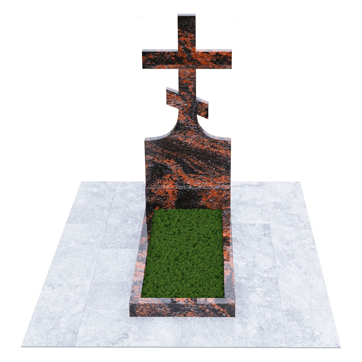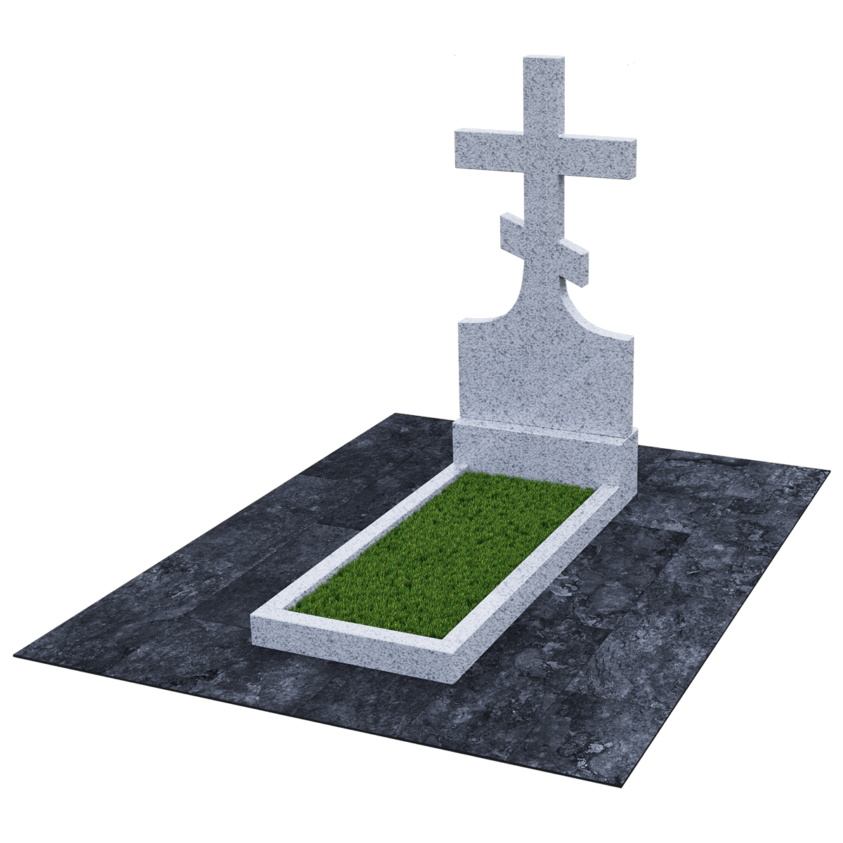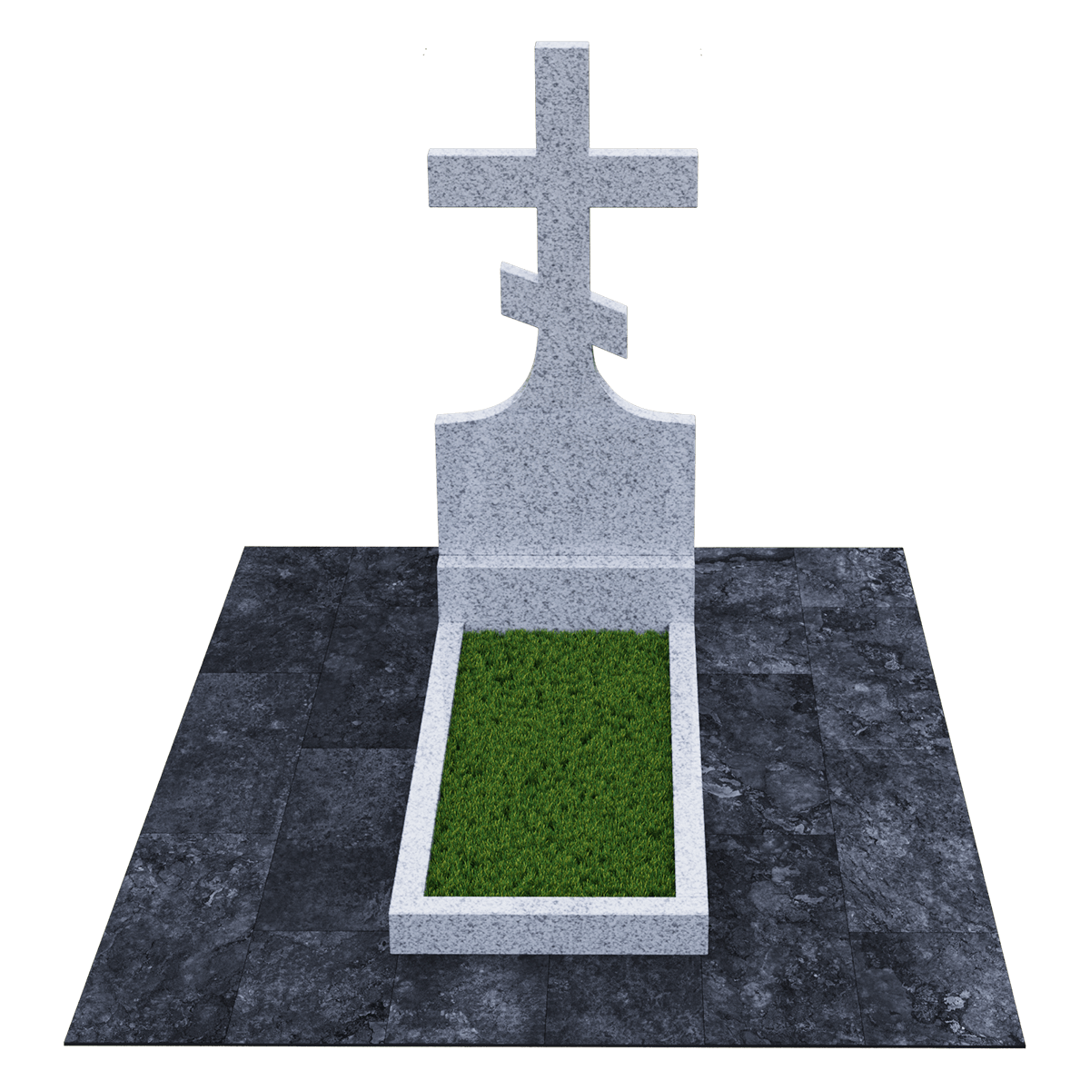 Мемориальный комплекс, предназначенный для классического могильного захоронения на кладбище. Для создания мемориала дизайнеры использовали натуральный гранит черного цвета с разнородными вкраплениями с присущим естественным орнаментом в виде прожилок. Полированный гранит является одним из самых прочных и долговечных материалов, подходящих для установки под открытым небом, так как не поддается разрушительному воздействию атмосферных явлений и микрогрибков. Комплекс состоит из вертикальной стелы, установленной на прочном основании и примыкающего к нему цветника. Стела представляет собой крест с двумя перекладинами, стоящий на подобии погоста. Такой памятник устанавливается на могилу православного христианина. Цветник прямоугольной формы по желанию можно закрыть надгробием или, используя дополнительные накладки, изменить его форму. На могилах с крестом обычно не присутствует портрет, а только персональные данные. Но вполне уместно изображение религиозной атрибутики и элементов художественного декора, качественно выполненной дизайнерами методом гравировки. Все образцы представлены в каталоге.
